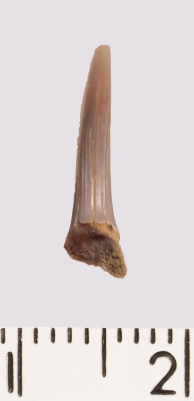 Зуб (фрагмент). Акула. Scapanorhynchus rhaphiodon Agassiz 1843. Классификация: Хордовые Chordata, Позвоночные Vertebrata, Хрящевые рыбы Chondrichthyes, Пластиножаберные Elasmobranchii