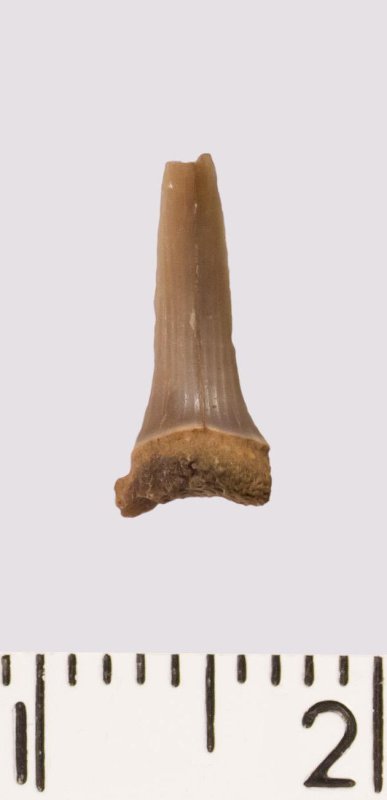 Зуб (фрагмент). Акула. Scapanorhynchus rhaphiodon Agassiz 1843. Классификация: Хордовые Chordata, Позвоночные Vertebrata, Хрящевые рыбы Chondrichthyes, Пластиножаберные Elasmobranchii