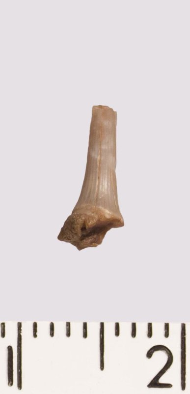 Зуб (фрагмент). Акула. Scapanorhynchus rhaphiodon Agassiz 1843. Классификация: Хордовые Chordata, Позвоночные Vertebrata, Хрящевые рыбы Chondrichthyes, Пластиножаберные Elasmobranchii
