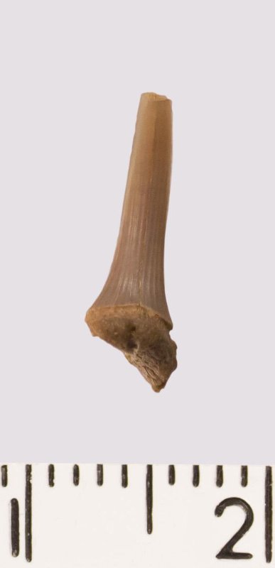 Зуб (фрагмент). Акула. Scapanorhynchus rhaphiodon Agassiz 1843. Классификация: Хордовые Chordata, Позвоночные Vertebrata, Хрящевые рыбы Chondrichthyes, Пластиножаберные Elasmobranchii