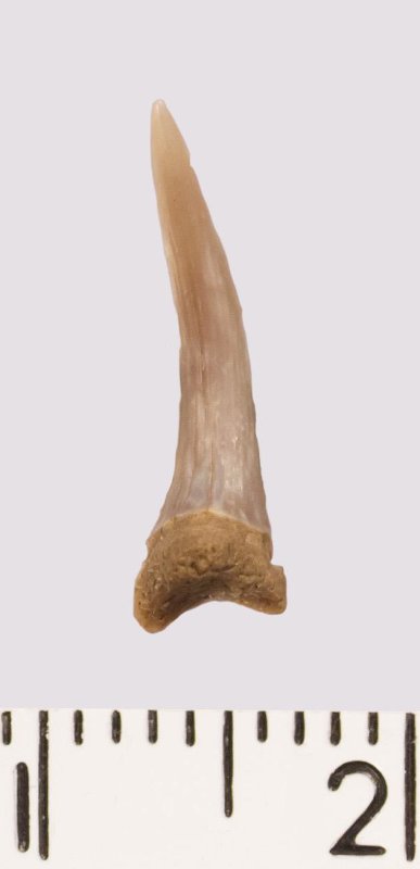 Зуб (фрагмент). Акула. Scapanorhynchus rhaphiodon Agassiz 1843. Классификация: Хордовые Chordata, Позвоночные Vertebrata, Хрящевые рыбы Chondrichthyes, Пластиножаберные Elasmobranchii