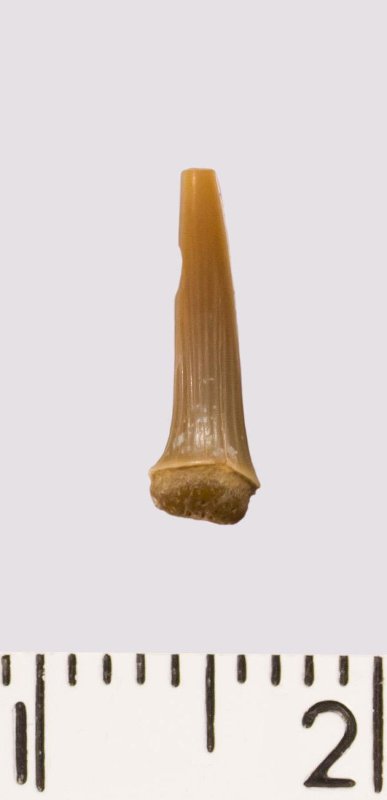 Зуб (фрагмент). Акула. Scapanorhynchus rhaphiodon Agassiz 1843. Классификация: Хордовые Chordata, Позвоночные Vertebrata, Хрящевые рыбы Chondrichthyes, Пластиножаберные Elasmobranchii