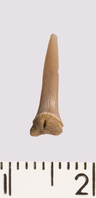 Зуб (фрагмент). Акула. Scapanorhynchus rhaphiodon Agassiz 1843. Классификация: Хордовые Chordata, Позвоночные Vertebrata, Хрящевые рыбы Chondrichthyes, Пластиножаберные Elasmobranchii