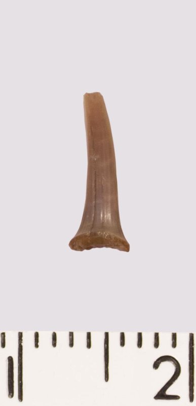 Зуб (фрагмент). Акула. Scapanorhynchus rhaphiodon Agassiz 1843. Классификация: Хордовые Chordata, Позвоночные Vertebrata, Хрящевые рыбы Chondrichthyes, Пластиножаберные Elasmobranchii