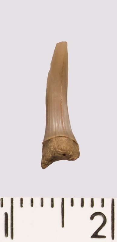 Зуб (фрагмент). Акула. Scapanorhynchus rhaphiodon Agassiz 1843. Классификация: Хордовые Chordata, Позвоночные Vertebrata, Хрящевые рыбы Chondrichthyes, Пластиножаберные Elasmobranchii
