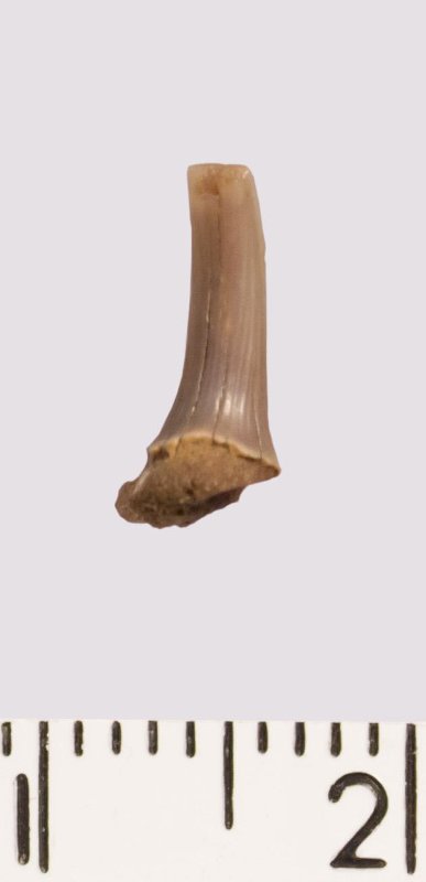 Зуб (фрагмент). Акула. Scapanorhynchus rhaphiodon Agassiz 1843. Классификация: Хордовые Chordata, Позвоночные Vertebrata, Хрящевые рыбы Chondrichthyes, Пластиножаберные Elasmobranchii