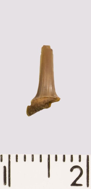 Зуб (фрагмент). Акула. Scapanorhynchus rhaphiodon Agassiz 1843. Классификация: Хордовые Chordata, Позвоночные Vertebrata, Хрящевые рыбы Chondrichthyes, Пластиножаберные Elasmobranchii