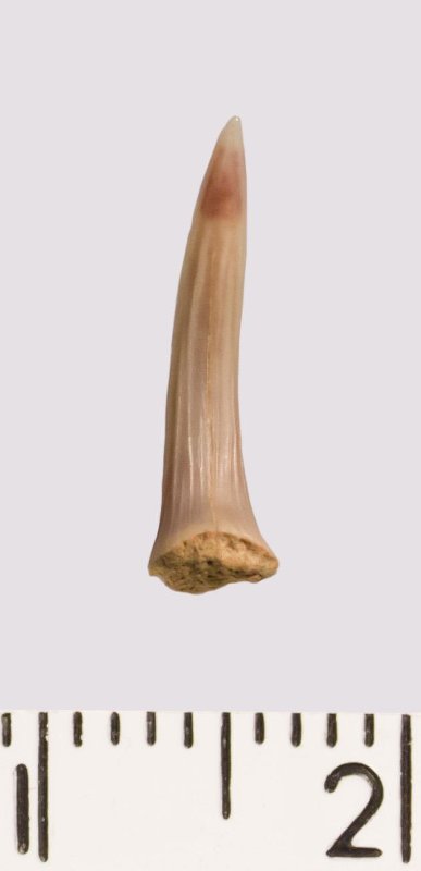 Зуб (фрагмент). Акула. Scapanorhynchus rhaphiodon Agassiz 1843. Классификация: Хордовые Chordata, Позвоночные Vertebrata, Хрящевые рыбы Chondrichthyes, Пластиножаберные Elasmobranchii