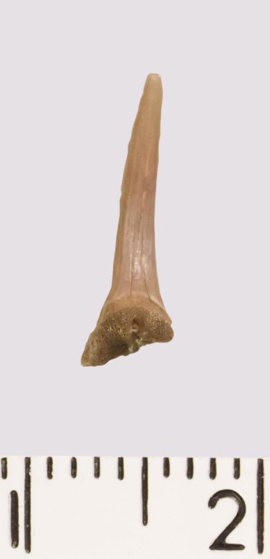 Зуб (фрагмент). Акула. Scapanorhynchus rhaphiodon Agassiz 1843. Классификация: Хордовые Chordata, Позвоночные Vertebrata, Хрящевые рыбы Chondrichthyes, Пластиножаберные Elasmobranchii