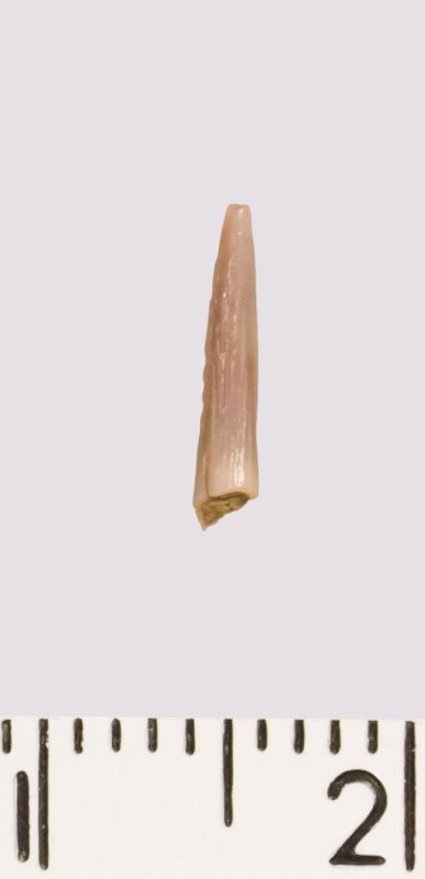 Зуб (фрагмент). Акула. Scapanorhynchus rhaphiodon Agassiz 1843. Классификация: Хордовые Chordata, Позвоночные Vertebrata, Хрящевые рыбы Chondrichthyes, Пластиножаберные Elasmobranchii