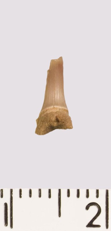 Зуб (фрагмент). Акула. Scapanorhynchus rhaphiodon Agassiz 1843. Классификация: Хордовые Chordata, Позвоночные Vertebrata, Хрящевые рыбы Chondrichthyes, Пластиножаберные Elasmobranchii