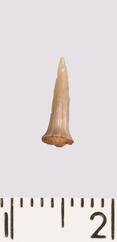 Зуб (фрагмент). Акула. Scapanorhynchus rhaphiodon Agassiz 1843. Классификация: Хордовые Chordata, Позвоночные Vertebrata, Хрящевые рыбы Chondrichthyes, Пластиножаберные Elasmobranchii