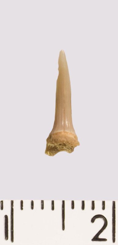 Зуб (фрагмент). Акула. Scapanorhynchus rhaphiodon Agassiz 1843. Классификация: Хордовые Chordata, Позвоночные Vertebrata, Хрящевые рыбы Chondrichthyes, Пластиножаберные Elasmobranchii