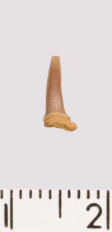 Зуб (фрагмент). Акула. Scapanorhynchus rhaphiodon Agassiz 1843. Классификация: Хордовые Chordata, Позвоночные Vertebrata, Хрящевые рыбы Chondrichthyes, Пластиножаберные Elasmobranchii