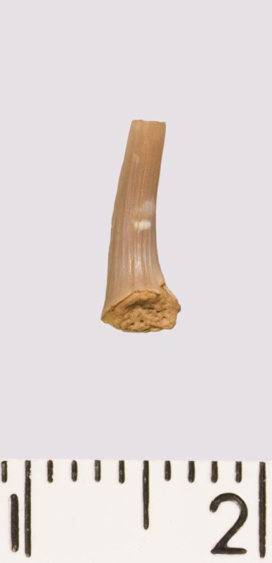 Зуб (фрагмент). Акула. Scapanorhynchus rhaphiodon Agassiz 1843. Классификация: Хордовые Chordata, Позвоночные Vertebrata, Хрящевые рыбы Chondrichthyes, Пластиножаберные Elasmobranchii