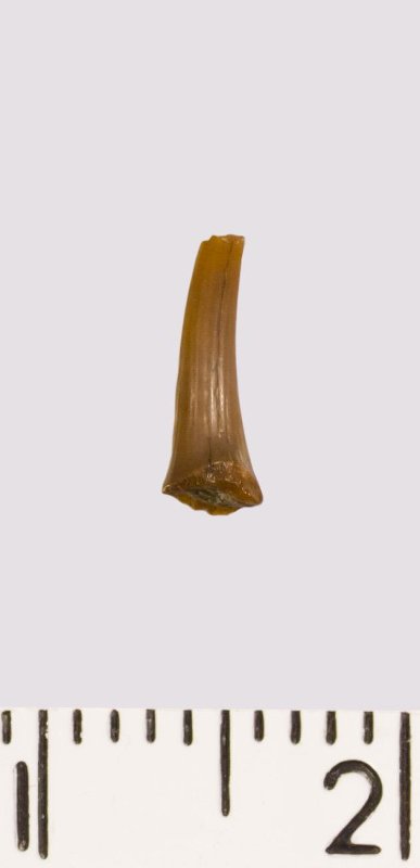 Зуб (фрагмент). Акула. Scapanorhynchus rhaphiodon Agassiz 1843. Классификация: Хордовые Chordata, Позвоночные Vertebrata, Хрящевые рыбы Chondrichthyes, Пластиножаберные Elasmobranchii