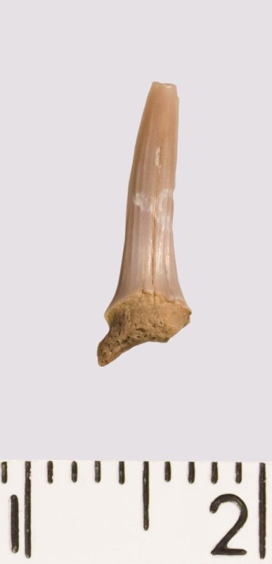 Зуб (фрагмент). Акула. Scapanorhynchus rhaphiodon Agassiz 1843. Классификация: Хордовые Chordata, Позвоночные Vertebrata, Хрящевые рыбы Chondrichthyes, Пластиножаберные Elasmobranchii