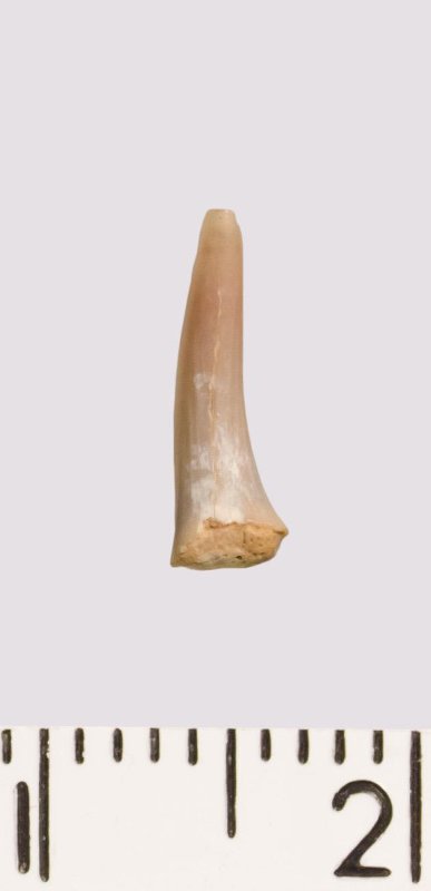 Зуб (фрагмент). Акула. Scapanorhynchus rhaphiodon Agassiz 1843. Классификация: Хордовые Chordata, Позвоночные Vertebrata, Хрящевые рыбы Chondrichthyes, Пластиножаберные Elasmobranchii