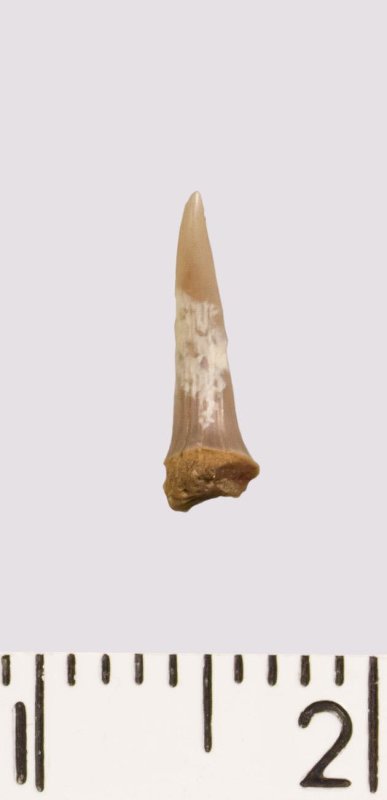 Зуб (фрагмент). Акула. Scapanorhynchus rhaphiodon Agassiz 1843. Классификация: Хордовые Chordata, Позвоночные Vertebrata, Хрящевые рыбы Chondrichthyes, Пластиножаберные Elasmobranchii