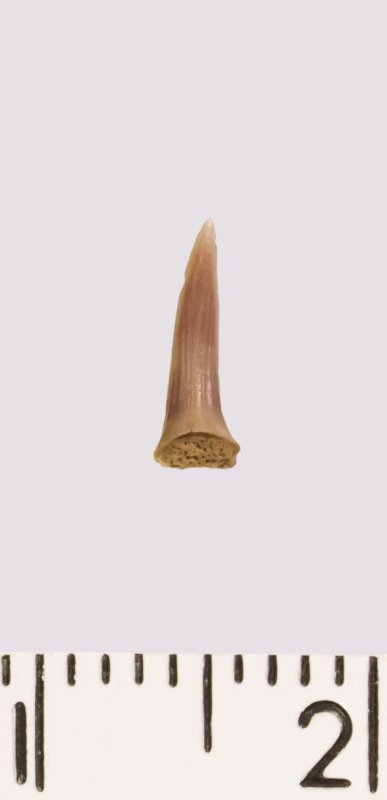 Зуб (фрагмент). Акула. Scapanorhynchus rhaphiodon Agassiz 1843. Классификация: Хордовые Chordata, Позвоночные Vertebrata, Хрящевые рыбы Chondrichthyes, Пластиножаберные Elasmobranchii