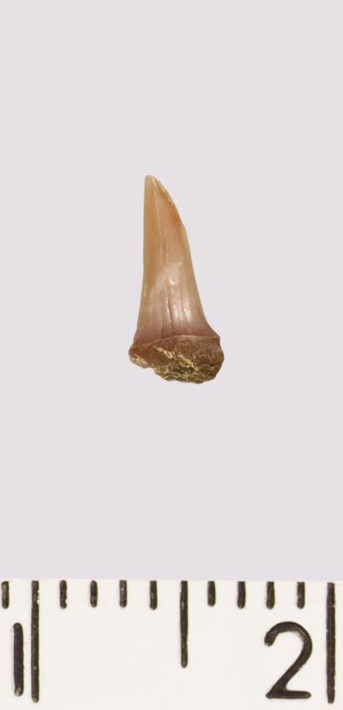 Зуб (фрагмент). Акула. Scapanorhynchus rhaphiodon Agassiz 1843. Классификация: Хордовые Chordata, Позвоночные Vertebrata, Хрящевые рыбы Chondrichthyes, Пластиножаберные Elasmobranchii