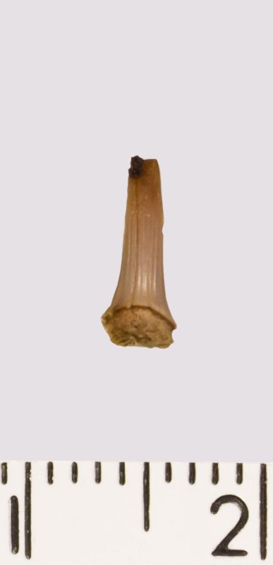 Зуб (фрагмент). Акула. Scapanorhynchus rhaphiodon Agassiz 1843. Классификация: Хордовые Chordata, Позвоночные Vertebrata, Хрящевые рыбы Chondrichthyes, Пластиножаберные Elasmobranchii