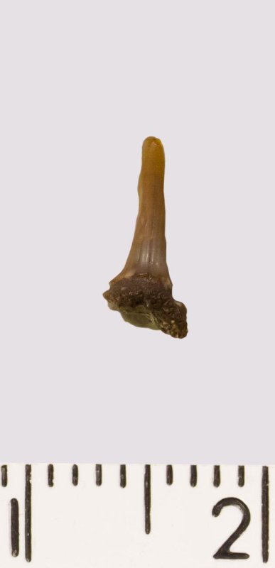 Зуб (фрагмент). Акула. Scapanorhynchus rhaphiodon Agassiz 1843. Классификация: Хордовые Chordata, Позвоночные Vertebrata, Хрящевые рыбы Chondrichthyes, Пластиножаберные Elasmobranchii