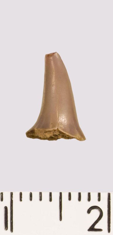 Зуб (фрагмент). Акула. Eostriatolamia venusta Leriche, 1906. Классификация: Хордовые Chordata, Позвоночные Vertebrata, Хрящевые рыбы Chondrichthyes, Пластиножаберные Elasmobranchii