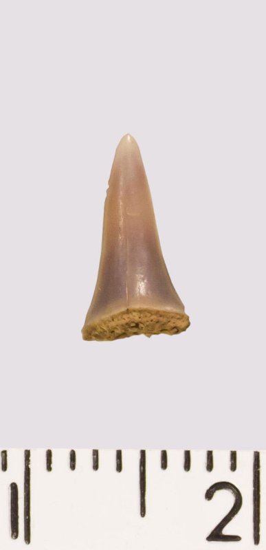 Зуб (фрагмент). Акула. Eostriatolamia venusta Leriche, 1906. Классификация: Хордовые Chordata, Позвоночные Vertebrata, Хрящевые рыбы Chondrichthyes, Пластиножаберные Elasmobranchii