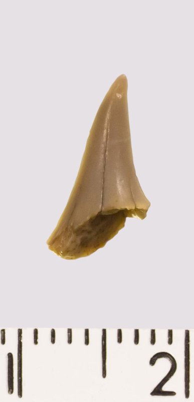 Зуб (фрагмент). Акула. Eostriatolamia venusta Leriche, 1906. Классификация: Хордовые Chordata, Позвоночные Vertebrata, Хрящевые рыбы Chondrichthyes, Пластиножаберные Elasmobranchii