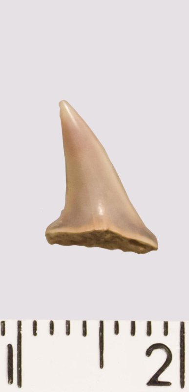 Зуб (фрагмент). Акула. Eostriatolamia venusta Leriche, 1906. Классификация: Хордовые Chordata, Позвоночные Vertebrata, Хрящевые рыбы Chondrichthyes, Пластиножаберные Elasmobranchii