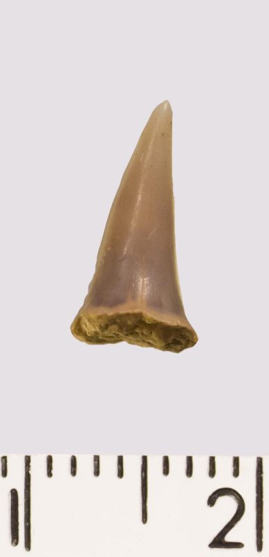 Зуб (фрагмент). Акула. Eostriatolamia venusta Leriche, 1906. Классификация: Хордовые Chordata, Позвоночные Vertebrata, Хрящевые рыбы Chondrichthyes, Пластиножаберные Elasmobranchii