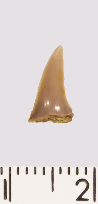 Зуб (фрагмент). Акула. Eostriatolamia venusta Leriche, 1906. Классификация: Хордовые Chordata, Позвоночные Vertebrata, Хрящевые рыбы Chondrichthyes, Пластиножаберные Elasmobranchii
