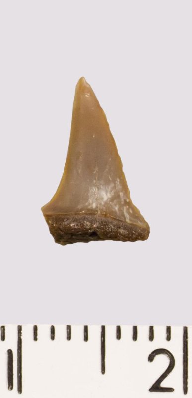 Зуб (фрагмент). Акула. Eostriatolamia venusta Leriche, 1906. Классификация: Хордовые Chordata, Позвоночные Vertebrata, Хрящевые рыбы Chondrichthyes, Пластиножаберные Elasmobranchii
