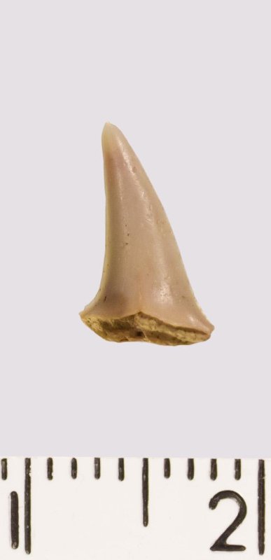 Зуб (фрагмент). Акула. Eostriatolamia venusta Leriche, 1906. Классификация: Хордовые Chordata, Позвоночные Vertebrata, Хрящевые рыбы Chondrichthyes, Пластиножаберные Elasmobranchii