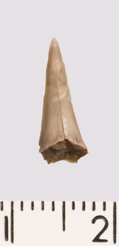 Зуб (фрагмент). Акула. Eostriatolamia venusta Leriche, 1906. Классификация: Хордовые Chordata, Позвоночные Vertebrata, Хрящевые рыбы Chondrichthyes, Пластиножаберные Elasmobranchii