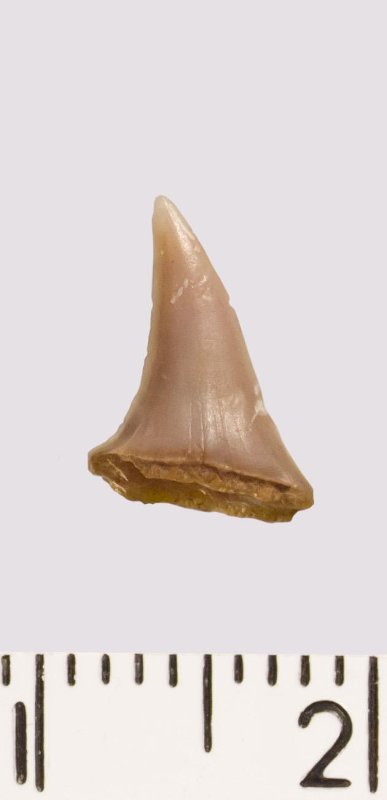 Зуб (фрагмент). Акула. Eostriatolamia venusta Leriche, 1906. Классификация: Хордовые Chordata, Позвоночные Vertebrata, Хрящевые рыбы Chondrichthyes, Пластиножаберные Elasmobranchii