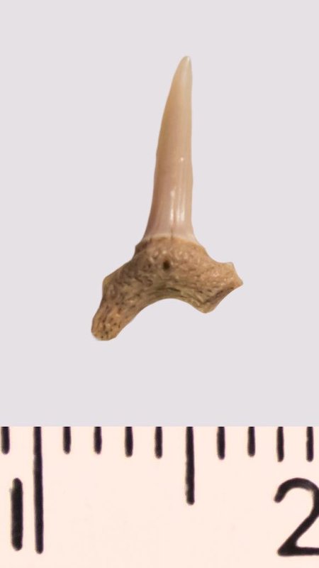 Зуб. Акула. Scapanorhynchus rhaphiodon Agassiz 1843. Классификация: Хордовые Chordata, Позвоночные Vertebrata, Хрящевые рыбы Chondrichthyes, Пластиножаберные Elasmobranchii