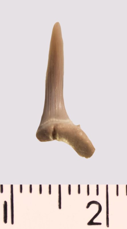 Зуб. Акула. Scapanorhynchus rhaphiodon Agassiz 1843. Классификация: Хордовые Chordata, Позвоночные Vertebrata, Хрящевые рыбы Chondrichthyes, Пластиножаберные Elasmobranchii