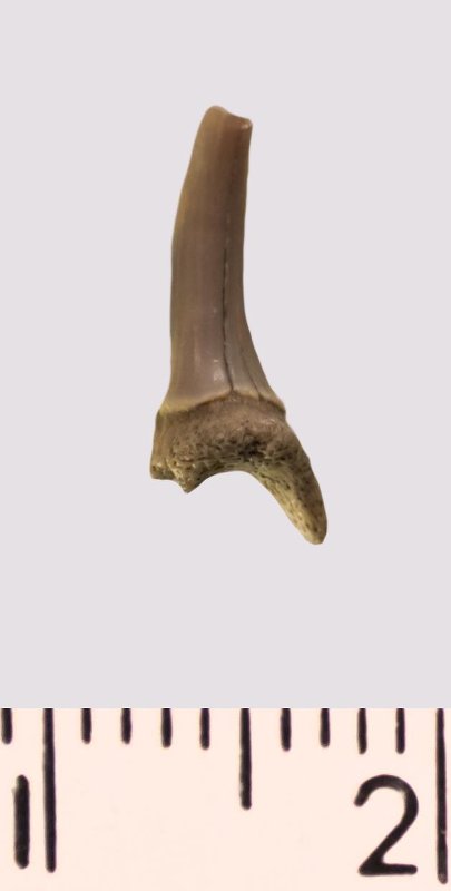 Зуб. Акула. Scapanorhynchus rhaphiodon Agassiz 1843. Классификация: Хордовые Chordata, Позвоночные Vertebrata, Хрящевые рыбы Chondrichthyes, Пластиножаберные Elasmobranchii