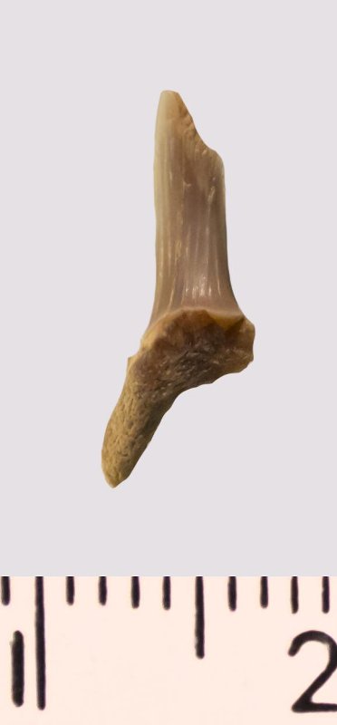 Зуб. Акула. Scapanorhynchus rhaphiodon Agassiz 1843. Классификация: Хордовые Chordata, Позвоночные Vertebrata, Хрящевые рыбы Chondrichthyes, Пластиножаберные Elasmobranchii