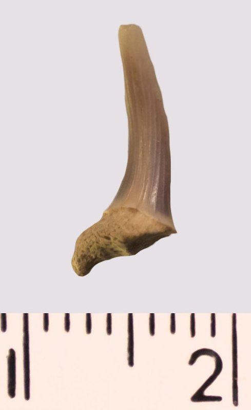 Зуб. Акула. Scapanorhynchus rhaphiodon Agassiz 1843. Классификация: Хордовые Chordata, Позвоночные Vertebrata, Хрящевые рыбы Chondrichthyes, Пластиножаберные Elasmobranchii