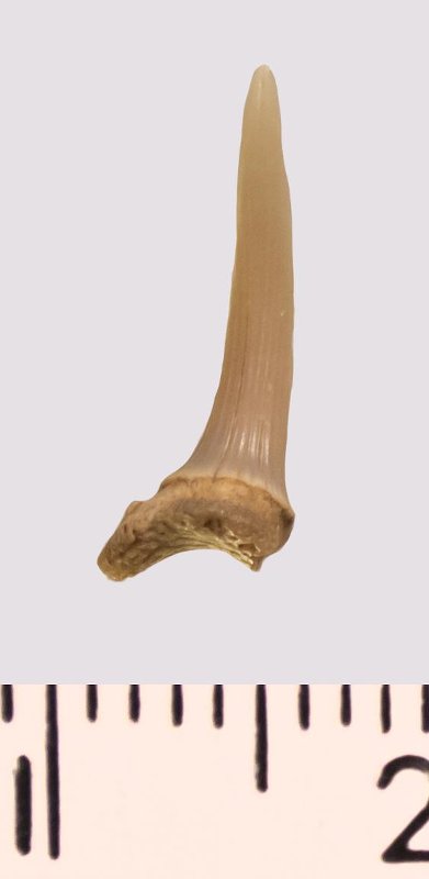 Зуб. Акула. Scapanorhynchus rhaphiodon Agassiz 1843. Классификация: Хордовые Chordata, Позвоночные Vertebrata, Хрящевые рыбы Chondrichthyes, Пластиножаберные Elasmobranchii