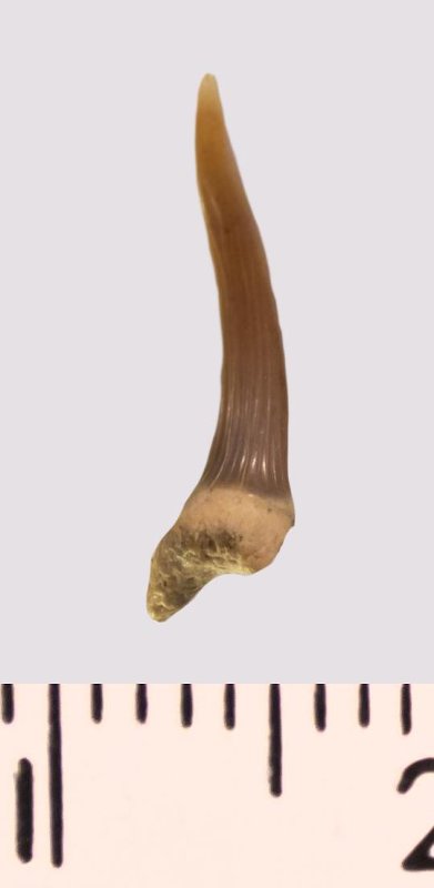 Зуб. Акула. Scapanorhynchus rhaphiodon Agassiz 1843. Классификация: Хордовые Chordata, Позвоночные Vertebrata, Хрящевые рыбы Chondrichthyes, Пластиножаберные Elasmobranchii