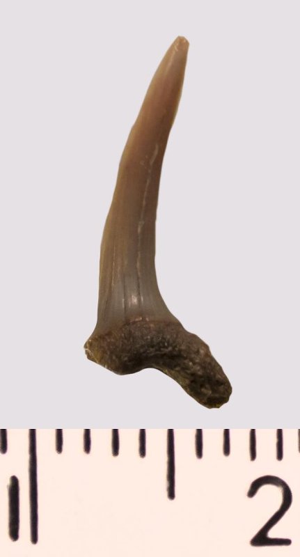 Зуб. Акула. Scapanorhynchus rhaphiodon Agassiz 1843. Классификация: Хордовые Chordata, Позвоночные Vertebrata, Хрящевые рыбы Chondrichthyes, Пластиножаберные Elasmobranchii