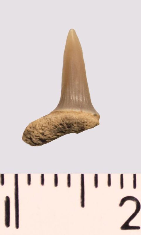 Зуб. Акула. Scapanorhynchus rhaphiodon Agassiz 1843. Классификация: Хордовые Chordata, Позвоночные Vertebrata, Хрящевые рыбы Chondrichthyes, Пластиножаберные Elasmobranchii