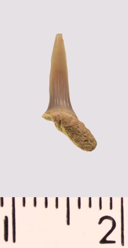Зуб. Акула. Scapanorhynchus rhaphiodon Agassiz 1843. Классификация: Хордовые Chordata, Позвоночные Vertebrata, Хрящевые рыбы Chondrichthyes, Пластиножаберные Elasmobranchii