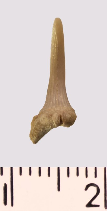Зуб. Акула. Scapanorhynchus rhaphiodon Agassiz 1843. Классификация: Хордовые Chordata, Позвоночные Vertebrata, Хрящевые рыбы Chondrichthyes, Пластиножаберные Elasmobranchii