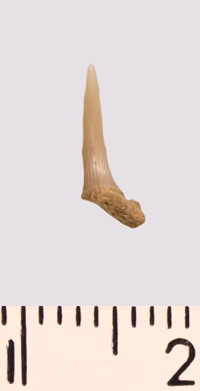 Зуб. Акула. Scapanorhynchus rhaphiodon Agassiz 1843. Классификация: Хордовые Chordata, Позвоночные Vertebrata, Хрящевые рыбы Chondrichthyes, Пластиножаберные Elasmobranchii