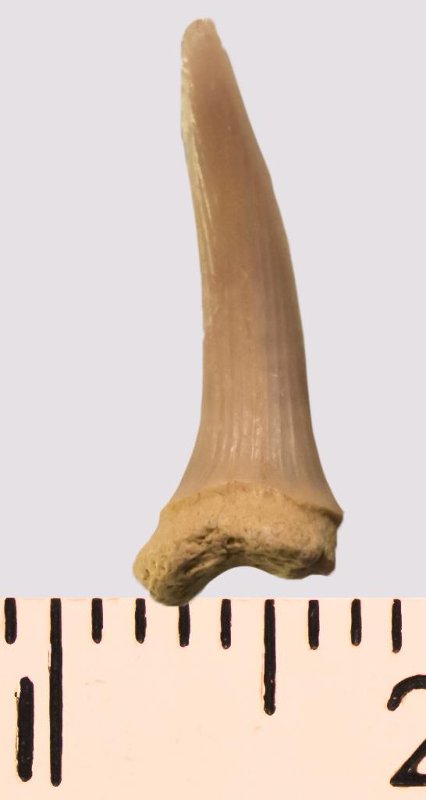 Зуб. Акула. Scapanorhynchus rhaphiodon Agassiz 1843. Классификация: Хордовые Chordata, Позвоночные Vertebrata, Хрящевые рыбы Chondrichthyes, Пластиножаберные Elasmobranchii